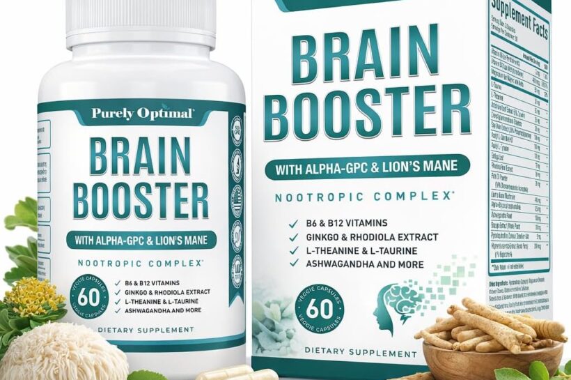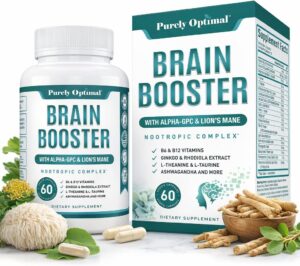 Purely Optimal Brain Booster Nootropic Supplement – Brain Support for Memory, Focus, Clarity, Jitter-Free Energy for Adults, Seniors– with Ginkgo Biloba, Alpha GPC, Lion’s Mane – 60 Capsules
